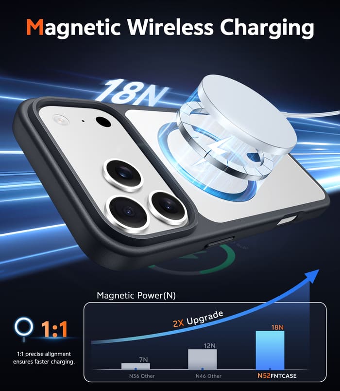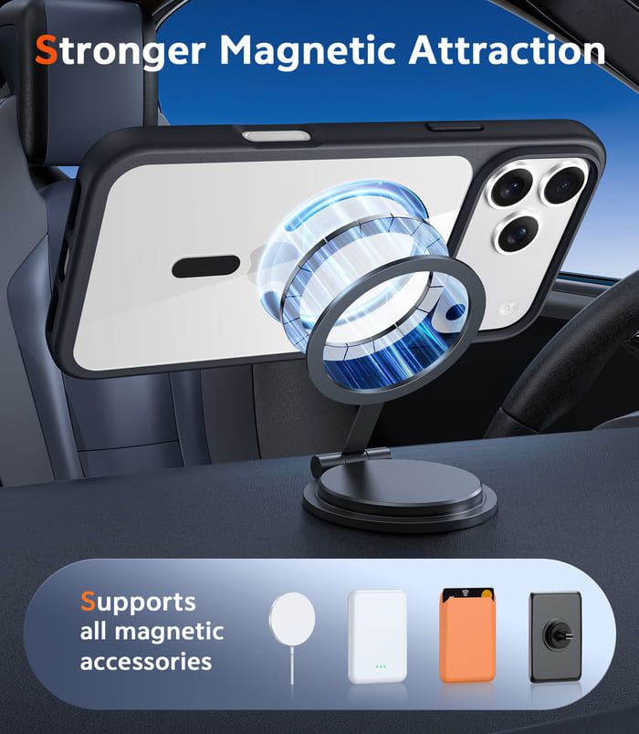 • Starke magnetische Anziehungskraft: Kompatibel mit magnetischen Ladegeräten und anderen kabellosen Qi-Ladegeräten ohne Signalbeeinflussung. Die magnetische Hülle des iPhone 17 Pro Max verfügt über 38 eingebaute Super-N52-Magnete. Ihre magnetische Anziehungskraft erreicht 2400 gf