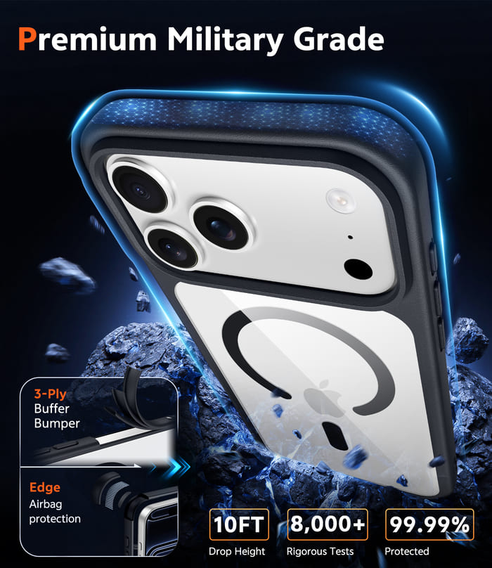 • 3 m Schutz in Militärqualität: Militärischer Falltest aus bis zu 3 m Höhe bestanden. Die transparente Rückwand des iPhone 17 Pro Max-Gehäuses besteht aus stabilem Polycarbonat und flexiblen, stoßfesten TPU-Stoßfängern am Rand und verfügt über 4 integrierte Eck-Airbags zur Stoßdämpfung.