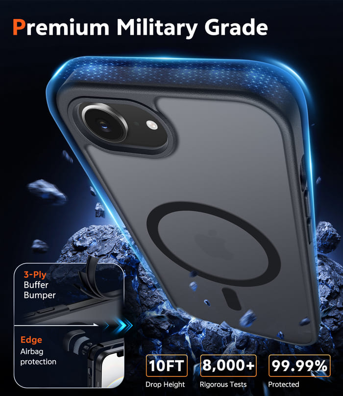 • 4,2 m Schutz nach Militärstandard: Militärischer Falltest aus bis zu 4,2 m Höhe bestanden. Die Rückwand dieser iPhone SE 4/SE 2025/16E Handyhülle besteht aus stabilem Polycarbonat und flexiblen, stoßfesten TPU-Stoßfängern am Rand. Sie verfügt über 4 integrierte Eck-Airbags zur Stoßdämpfung, die Ihr Handy vor versehentlichen Stürzen, Stößen und Kratzern schützen.