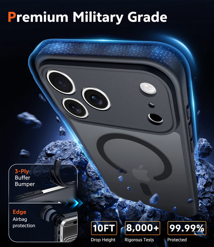 • 14FT Military Grade Drop Protection: Our iPhone 17 Pro (6.3 inch) case for backplane is made with rigid polycarbonate and flexible shockproof TPU bumpers around the edge and features 4 built-in corner Airbags to absorb impact, which can prevent your Phone from accidental drops, bumps, and scratches