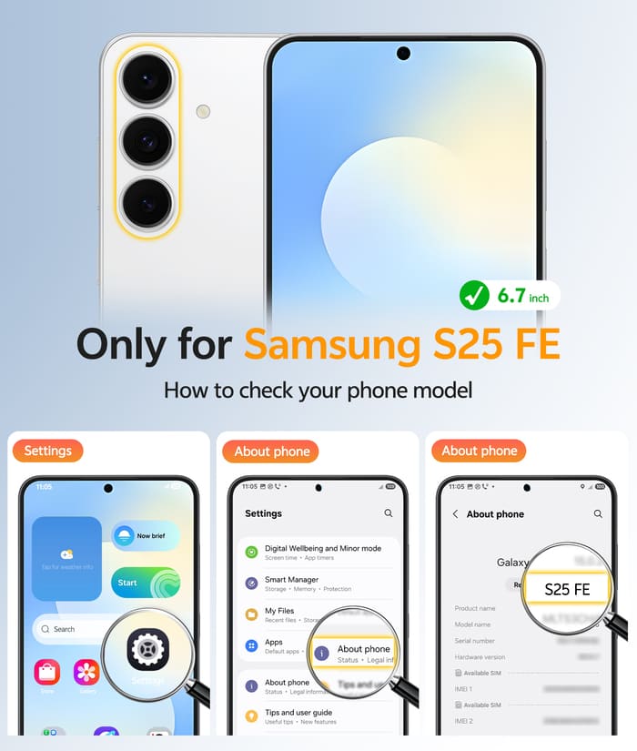 • Compatibility: Only for Samsung Galaxy S25 FE (6.7 inch). Please carefully confirm your phone model before making a purchase. Precise cutouts and tactile buttons ensure quick access and response, and full access to all ports