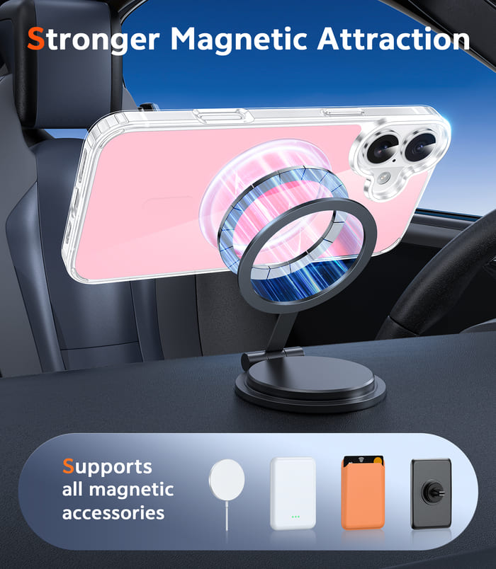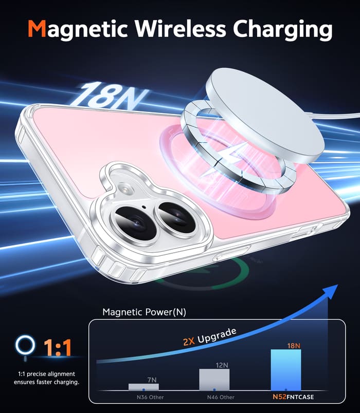 • Strong Magnetic Attraction: Compatible with Magnetic chargers and other Qi Wireless chargers without signal influence. The iPhone 17 magnetic case has built-in 38 super N52 magnets. Its magnetic attraction reaches 2400 gf