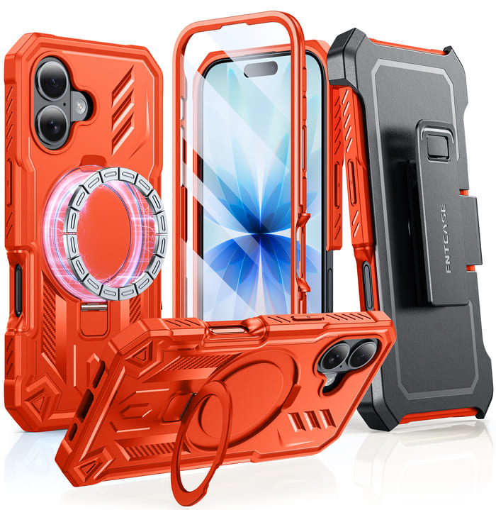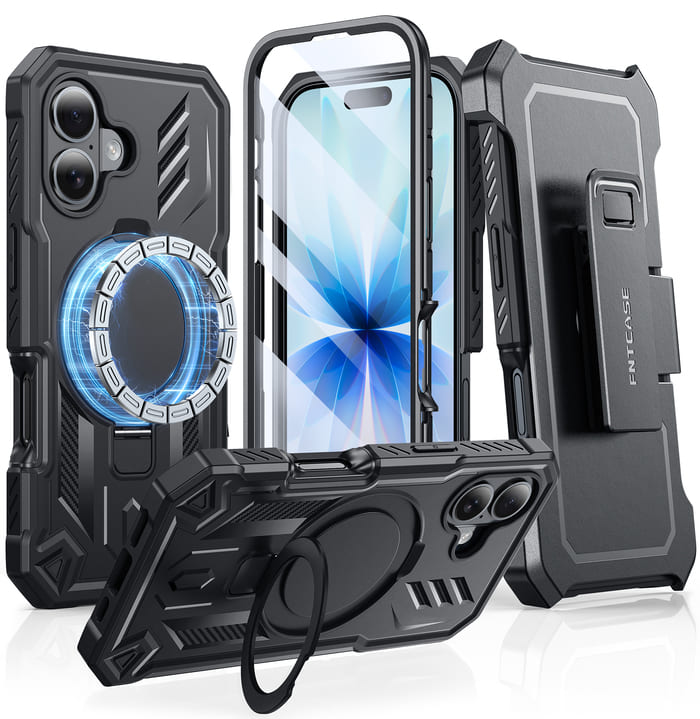 FNTCASE iPhone 17用ケース リングホルダー付き マグネット式キックスタンド ミリタリーグレード 耐衝撃保護 頑丈な携帯電話カバー ベルトクリップホルスター付き