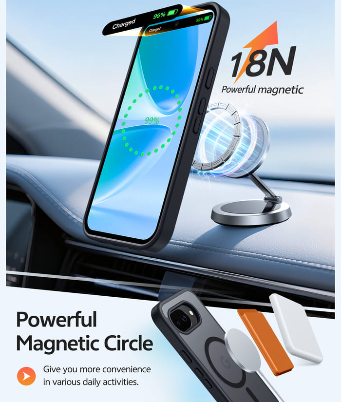 Strong Magnetic Attraction: Compatible with Magnetic chargers and other Qi Wireless chargers without signal interference. The Google Pixel 10A phone case has 38 super N52 magnets built in. Its magnetic attraction reaches 2400 gf, which is almost 7X stronger than ordinary, so it won't fall off, no matter how it shakes while charging.