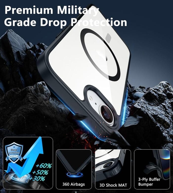 • 14FT Military Grade Drop Protection: Our iPhone SE 4/ SE 2025/ 16E phone case backplane is made with rigid polycarbonate and flexible shockproof TPU bumpers around the edge and features 4 built-in corner Airbags to absorb impact, which can protect your phone from accidental drops, bumps, and scratches.