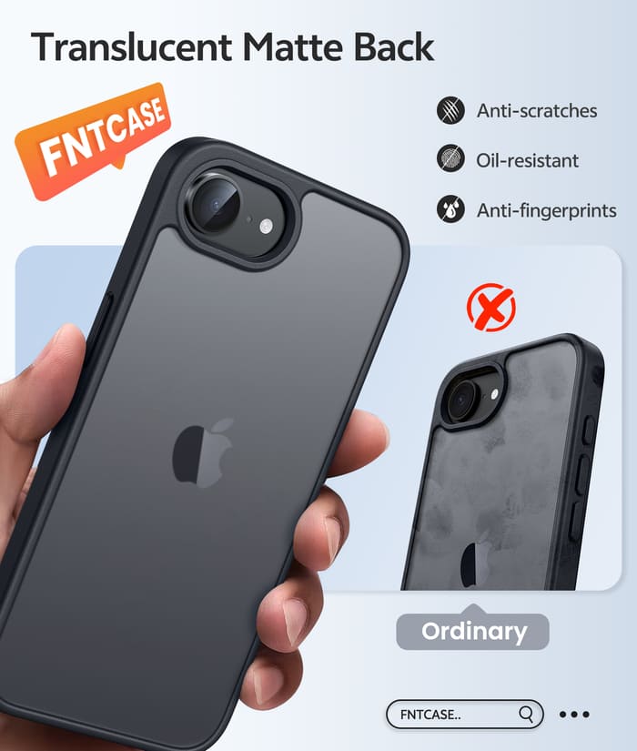 • Matte Texture & Superior Feel: The iPhone 17E/ 16E 6.1-inch phone case uses high-quality matte TPU and PC translucent material without covering the iPhone logo. The frosted surface provides a comfortable hand feel, and the nano-antioxidant layer can effectively prevent stains and scratches.