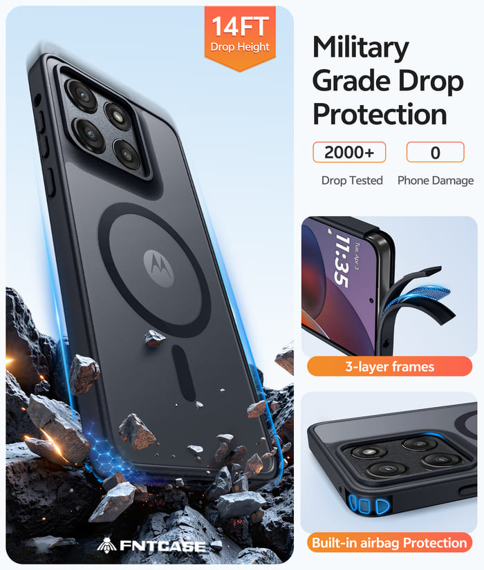 • 14FT Military Grade Drop Protection: Our phone case backplane is made of rigid polycarbonate and features flexible, shockproof TPU bumpers along the edges, with 4 built-in corner Airbags to absorb impact and protect your phone from accidental drops, bumps, and scratches.