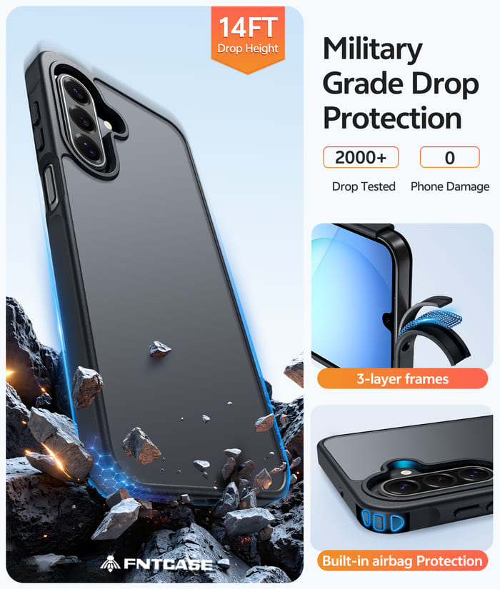 • 14FT Military Grade Drop Protection: Our Samsung Galaxy A16/A17 5G phone case backplane is made with rigid polycarbonate and flexible shockproof TPU bumpers around the edge and features 4 built-in corner Airbags to absorb impact, which can protect your phone from accidental drops, bumps, and scratches.