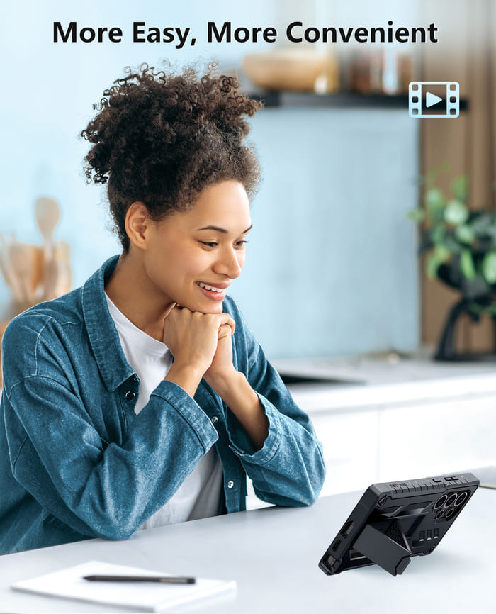 • Convenient Stand: The phone case for Samsung S24 Ultra comes with a hidden kickstand that supports portrait and landscape mode, enabling comfortable hands-free viewing of movies, web browsing, video chatting, and more